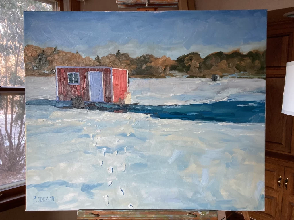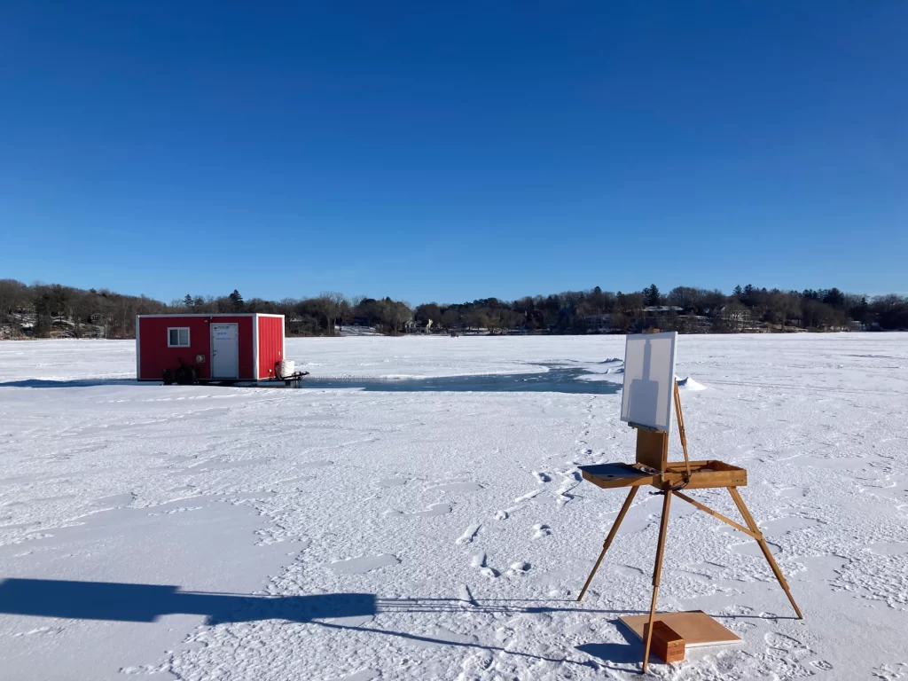Well, he had to cancel. I suddenly had the afternoon off and for those who have multiple children, you understand how rare that is. So I replanned my day with lots of reading etc. But, then again, I had the time, I had the gear. I looked at my weather app—9 degrees out. Yeesh, why couldn’t it be just a bit warmer? You probably guessed what I did next. Yes, I layered up, got that snazzy new (old) coat on along with a red Russian fur trapper hat my wife had hidden away in a winter bin. It was also again a cheeky nod to my old pal Vincent. I packed up my painting things and drove to a nearby lake, Lake Johanna. I would have painted on the much closer Lake Valentine which I love, but alas, no one was ice fishing there today. I knew that Johanna would have some shacks aboard, and I was right, noticing a good handful to choose from when I pulled into the lot.