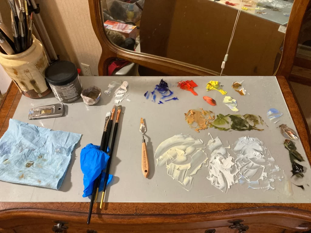 I began setting my easel up. In the warmth it’s not super easy, and in the howling icy winds it was, well, difficult. Up came the legs and I got the easel sitting straight up and ready for painting. Nice! Oh shoot, my trash bag was immediately ejected and skittered all the way across the lake in seconds. Whoops. Shoot, there went my trash collector. Then out flew my paper towels. Thankfully I reacted fast enough to catch up to them and stomp on them. Whew! That was close. Without paper towels I would have had to totally quit. This oil painter needs his paper towels. And at this point quitting really would have hurt. Okay time is wasting away and I need to paint as fast as I can. Most Plein Air Painters need to paint quickly because of the changing light. My quickness was due to not wanting to become one with the lake. The tubes of paint fought back as I tried squeezing dollops onto the palette. They were already getting very stiff. I mean I guess that makes a lot of sense being on a frozen tundra, a really pretty one at that. Okay focus.