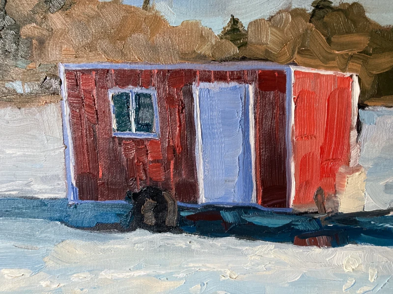 I looked around and immediately spotted this beautiful red boxy ice shack. It stood out from the rest by far, as it was red and red is my favorite color. Unfortunately it was quite far from the parking lot. Okay, I was so tempted to just take a few photos and call it good, or just walk a little and make some stuff up, or just not walk that far and set myself up. But after getting this far, I started to understand value a bit better. I needed to get the best spot, not just a good enough one. What was the point of only getting a decent-enough painting? No way, I was in this and in it hard. I trudged nearly half a mile to the red ice shack and set my stuff on the ground. Okay, this is it, here I go.
